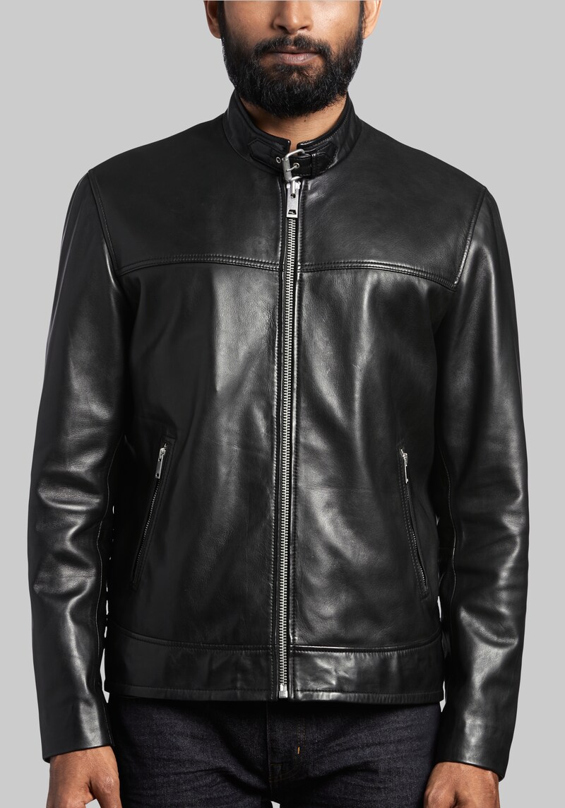 Live stylishly on the edge in this Italian lambskin leather moto jacket from Sly Co. With its buckled neck and zippered details, it exudes a cool attitude. Sly & Co Traditional Fit Lambskin Leather Moto Jacket.