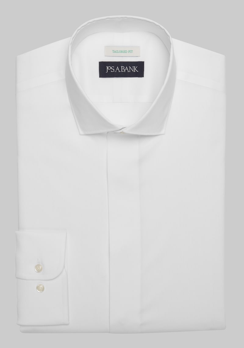 Crafted from a smooth cotton-poly blend with built-in stretch, this spread-collar dress shirt features a covered placket and Tailored Fit for a flattering silhouette. From Jos. A. Bank, it will elevate your dress-wear looks. Jos. A. Bank Tailored Fit Spread Collar Dress Shirt.