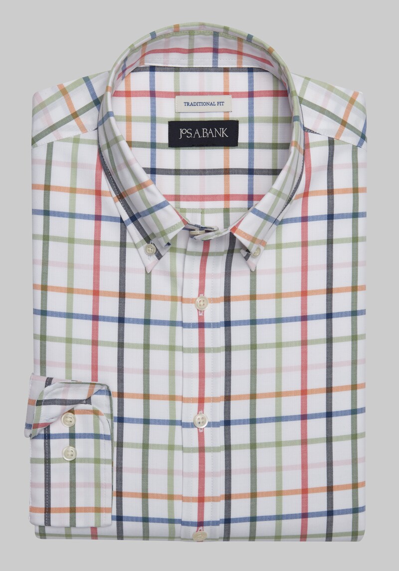 This piece features a button-down collar and a classic Tattersall plaid pattern, offering a touch of heritage and sophistication. The cotton fabric ensures breathability and comfort throughout the day. A hint of stretch allows for unrestricted movement, making it perfect for any activity. This versatile shirt seamlessly transitions from casual Fridays at the office to weekend adventures. Dress it up with chinos and loafers or down with jeans and sneakers for a timeless look that never goes out of style. Jos. A. Bank Comfort Stretch Traditional Fit Long Sleeve Sportshirt - Big & Tall.