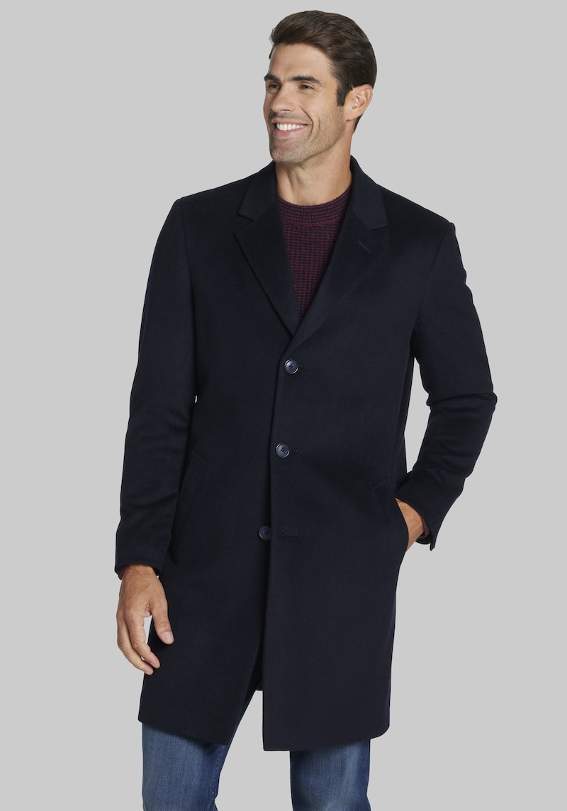 Ward off the chill in style with a wool-blend topcoat. This versatile outerwear piece offers the warmth of wool with the added benefit of easy care thanks to the fabric blend. Perfect for layering over a suit for added warmth during business meetings or dressing up a casual outfit for weekend outings, its a must-have for any fall or winter wardrobe. Jos. A. Bank Topcoat.