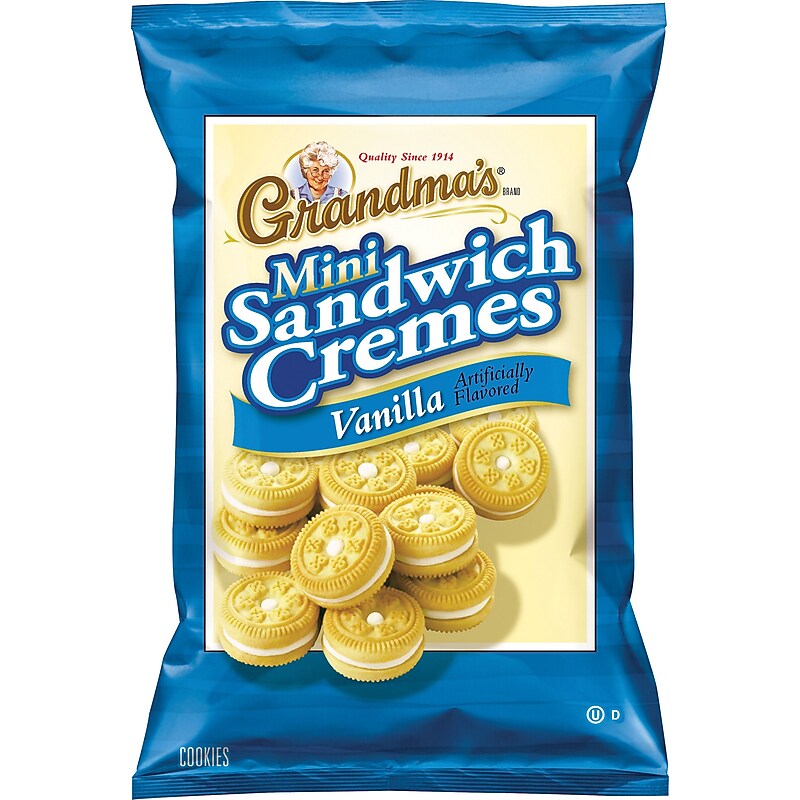 Grandma's Mini vanilla creme cookies are perfect for children's party. Cookies are sold in 3. 17 bag with 24 bags per box. Vanilla Creme Cookies. 24 bags per box. 3. 71 oz. bags. 0 grams trans fat. Grandma's Mini vanilla creme cookies have a delicious taste, sold in 3. 17 bag with 24 bags per box.