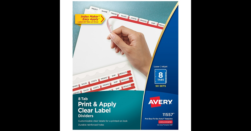 Easily create print shop quality personalized binder dividers with tabs using Avery Index Maker Clear Label Dividers. Customize the title tabs for your dividers quickly and easily using the free templates on the Avery website and print with your inkjet or laser printer for clean, professional looking results in minutes. This pack comes with 50 sets of 8-tab dividers, and the Easy Apply clear label strips make it simple to apply all 8 labels of each set at once. Just print, align labels against tabs, smooth down labels and peel up strip. Each 3-hole punched durable divider also features doubled-sided, reinforced tabs and edges to help resist tearing for long-lasting, everyday use. These 3 ring binder dividers with tabs are a great addition to your medical office supplies, school binders, personal organizers, tax office supplies, presentation reports and more. Print, peel, and press your way to a perfect, precise project. Save time and money by creating your own high-quality custom tab dividers using free templates from the Avery website and printing on your laser or inkjet printer. Label all 8 tab dividers at once with the Index Maker Easy Apply Label strip that results in 50 perfectly aligned sets of tabs. Get a professional, printed-on look with clear labels that virtually disappear on thedivider tabs. Great for organizing your medical document binder, meeting materials, proposals, tax organizer binder, financial planner and more. Long-lasting, tear-resistant tabbed dividers feature doubled-sided reinforced tabs and edges. Clear labels stand out againstbackground. 50 sets per box. Avery Index Makerand clear label tab dividers let your staff easily print and apply an organizational system.