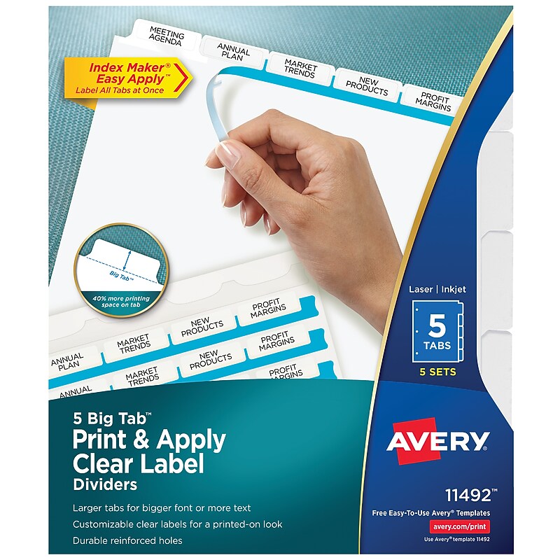 Don't waste time and money ordering custom printed binder dividers with tabs when you can easily create and print your own personalized dividers with Avery Index Maker Clear Label Big Tab Dividers. Our larger Big Tab design offers more room for bigger fonts, more text and even logos or images. Customize your title tabs quickly and easily using the free templates on the Avery website and print with your inkjet or laser printer for clean, professional looking results in minutes. This pack comes with 5 sets of 5-tab dividers, and the Easy Apply clear label strips make it simple to apply all 5 labels of each set at once. Just print, align labels against tabs, smooth down labels and peel up strip. Each 3-hole punched durable divider also features doubled-sided, reinforced tabs and edges to help resist tearing for long-lasting, everyday use. These 3 ring binder dividers with tabs are a great addition to your medical office supplies, school binders, personal organizers, tax office supplies, presentation reports and more. Print, peel, and press your way to a perfect, precise project. Get 40% more writing space than other tabbed dividers with our Big Tab design, perfect for more text, bigger fonts, logos and more. Save time and money by creating your own high-quality custom tab dividers using free templates from the Avery website and printing on your laser or inkjet printer. Label all 5 tab dividers at once with the Index Maker Easy Apply Label strip that results in five perfectly aligned sets of tabs. Get a professional, printed-on look with clear labels that virtually disappear on thedivider tabs. Great for organizing your medical document binder, meeting materials, proposals, tax organizer binder, financial planner and more. Subdivide your file folders with this five-pack of Avery Big Tab Index Maker five-tab clear-labeldividers.