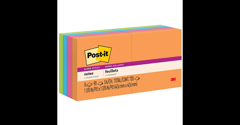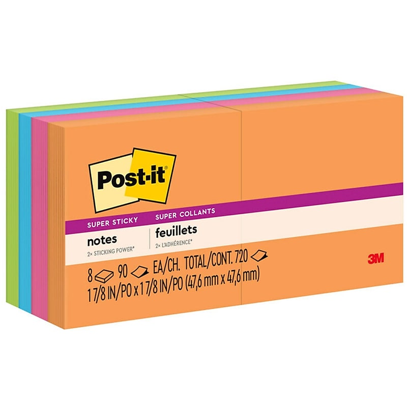 Uplift your spirits and messages via the vibrant, strong colors of the Energy Boost collection. Whether jotting down your daily to-do's, brainstorming big ideas, studying or setting reminders, colors and ideas are always brighter together. These sticky notes feature 2X the sticking power. They also stick and re-stick - allowing you to move your notes with you throughout your day. Theyre ideal for walls, doors, windows and other vertical surfaces, and like all Post-it Notes, they stick securely yet remove cleanly without damage. Keep your ideas across your notebooks, classroom books, calendars or other documents. No tape or tacks are needed with adhesive notes, saving you money and time on office products or school supplies. A great memo pad, these are ideal for using for notes or reminders to yourself or others. Post-it Super Sticky Notes are the perfect solution for shopping lists, reminders, notes on computer screens, time tracking, to-do lists, marking cables, color-coding documents, reminding kids to do chores, storyboarding, scratch paper and agile processing. This pack comes with 8 pads of mini 1 7/8 in. 1 7/8 in. sticky notes. All pads are 90 sheets. These colorful sticky notes include colors from the Energy Boost collection including orange, green, yellow, purple,and pink. All Post-it Notes are sourced from certified, renewable and responsibly managed forests, and all Post-it Notes are recyclable, so you can recycle them when they are no longer needed. STICK AND RESTICK ANYWHERE: These notes adhere firmly to walls, windows, doors, and other vertical surfaces, allowing you to move your reminders with ease. INTRODUCING THE ENERGY BOOST COLLECTION: Uplift your spirits and messages via the vibrant colors of Vital Orange, Tropical Pink, Blue Paradise and Limeade from the Energy Boost collection. VALUE-PACKED CONVENIENCE: This pack comes with 8 pads of mini 1 7/8 in. 1 7/8 in. sticky notes that are 90 sheets. EXPERIENCE THE POWER OF 2X STICKINESS: Post-it Super Sticky Notes offer twice the sticking power of basic sticky notes, ensuring they stay put and won't fall off. VERSATILE AND ESSENTIAL: Post-it Super Sticky Notes are the perfect solution for shopping lists, reminders, to-do lists, color-coding, labeling, family chore reminders, brainstorming, storyboarding, and quick notes. VARIOUS SIZES AND SHAPES: Available in different sizes, with or without lines, to cater to your specific needs. EYE-CATCHING COLORS: Vibrant and colorful reminders are more likely to grab attention and be noticed. EXPLORE OUR COLLECTIONS: With 11 color collections, the Post-it Brand offers a wide range of options to suit every style and preference, whether at home, in school, or at the office. TRUST THE ORIGNAL CREATOR: Made in the USA with globally sourced materials, the one and only Post-it Note was invented over 40 years ago by the Post-it Brand. SUSTAINABILITY: Post-it Super Sticky Notes can be recycled. ENHANCE YOUR NOTE-TAKING EXPERIENCE: Download the free Post-it App on your smartphone or tablet to enjoy the simplicity and convenience of Post-it Notes anytime and anywhere.