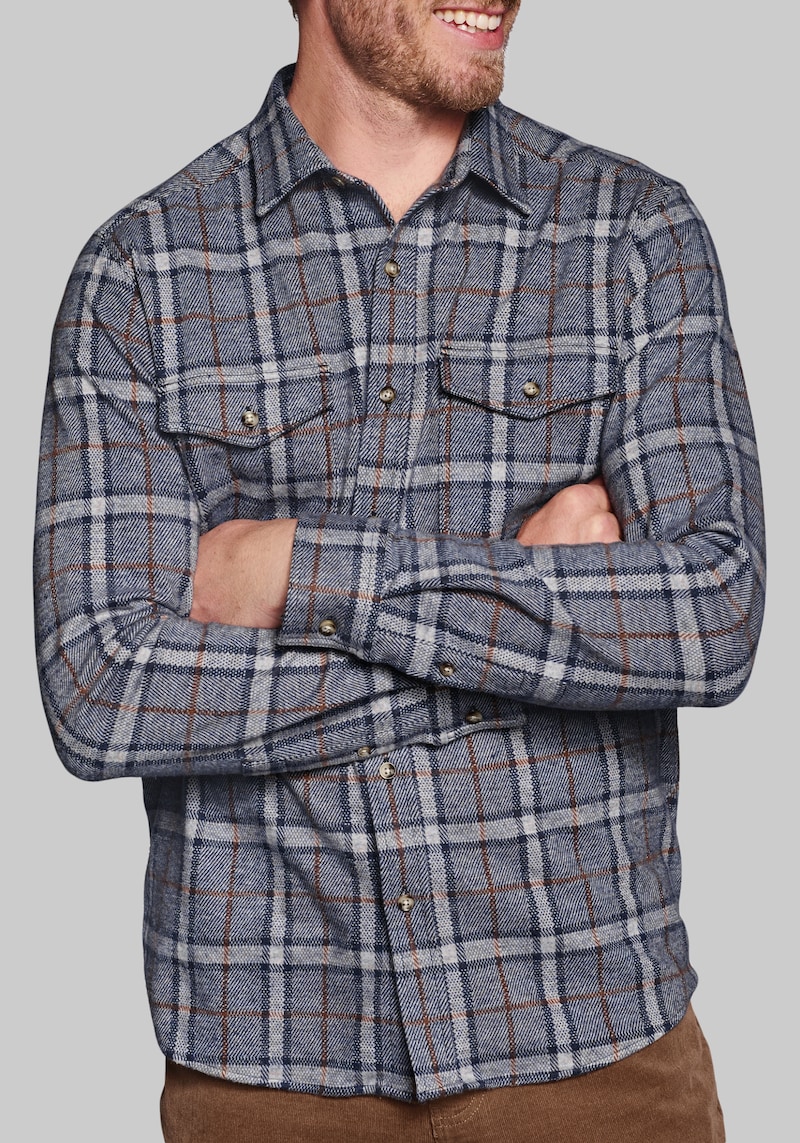 Woven in a luxuriously soft, brushed knit, this ruggedly handsome shirt offers exceptional comfort and warmth. The shirt-jacket weight makes it perfect for layering over a tee, while the point collar and button-flap chest pockets provide a classic look. Johnston & Murphy Tailored Fit Brushed Button-Front Knit Shirt.