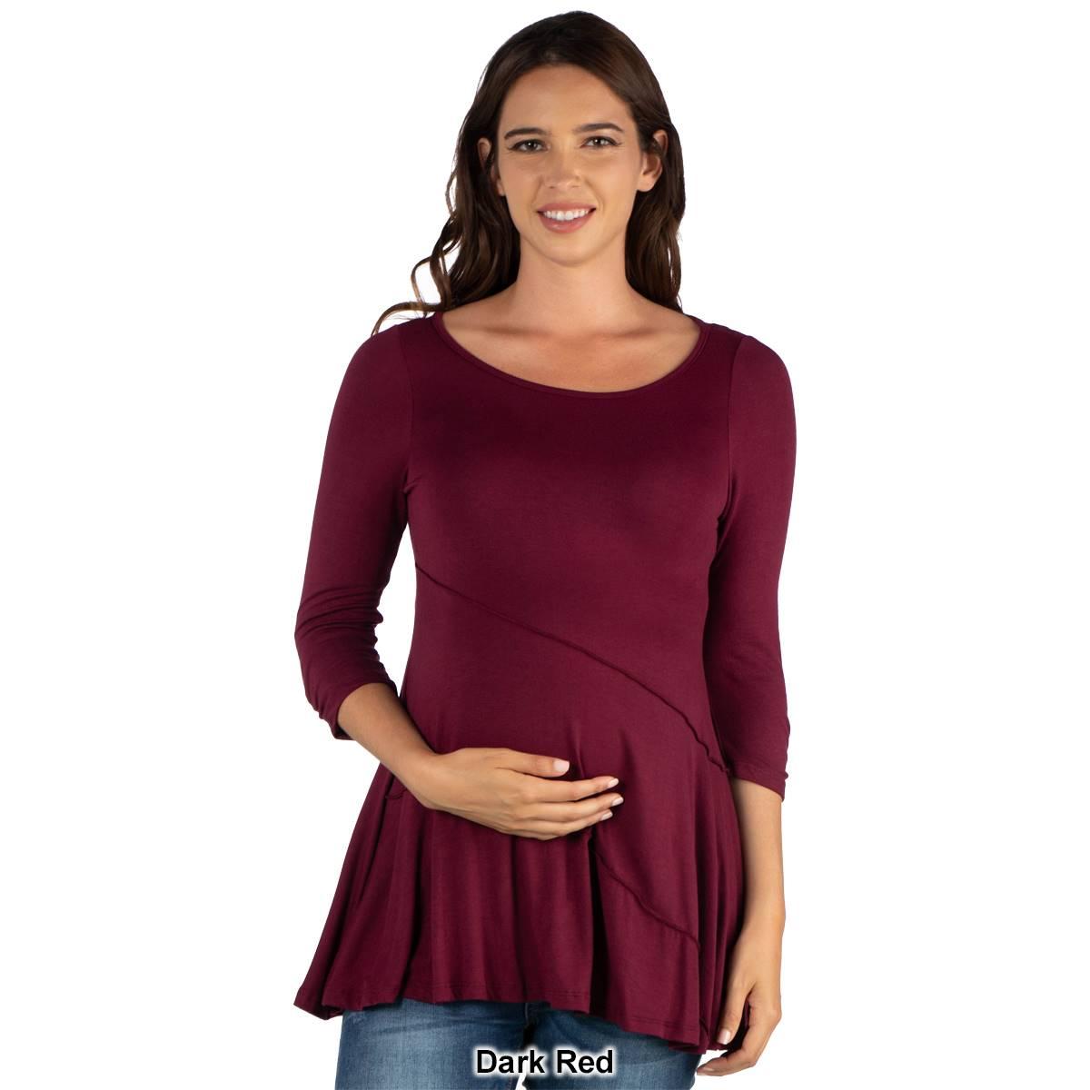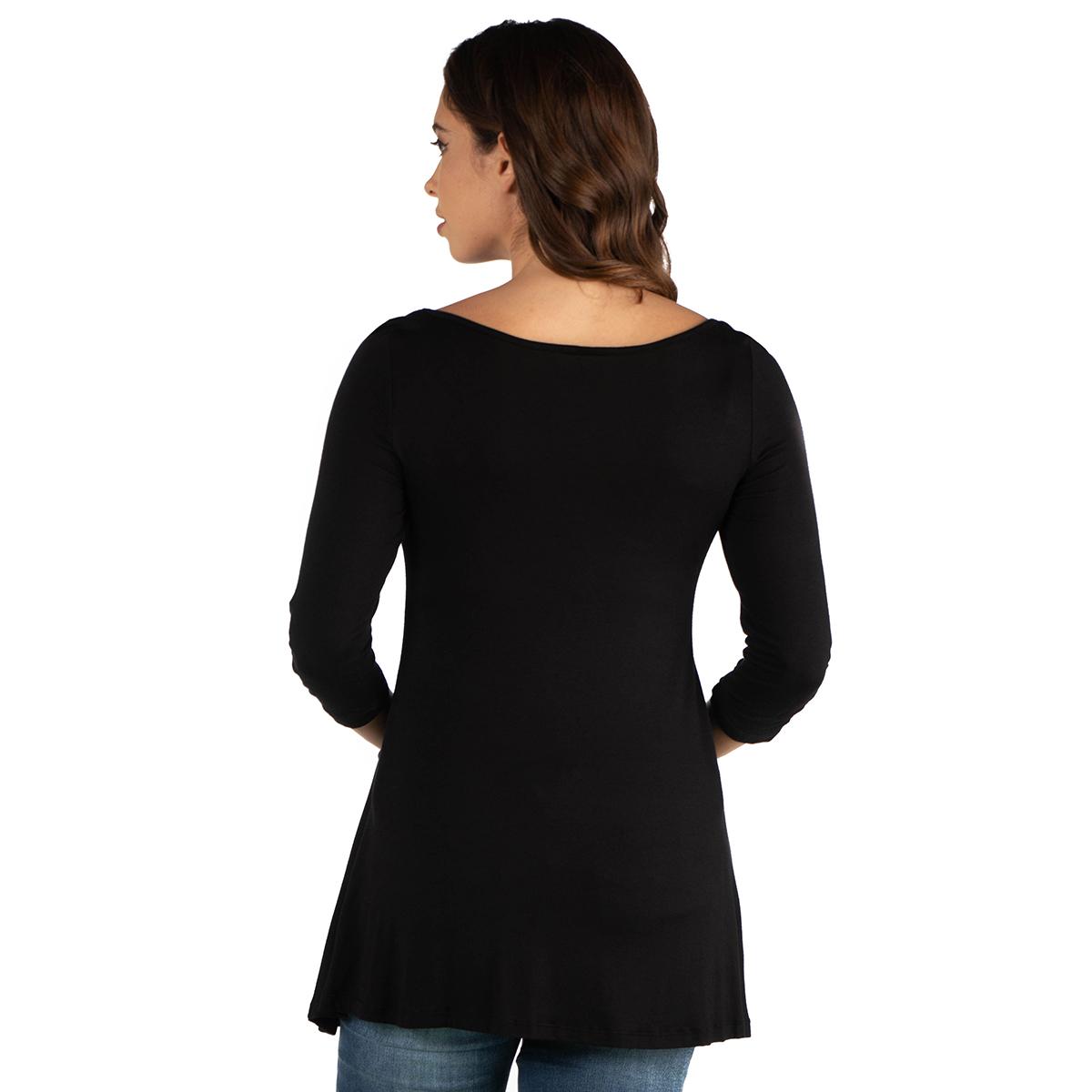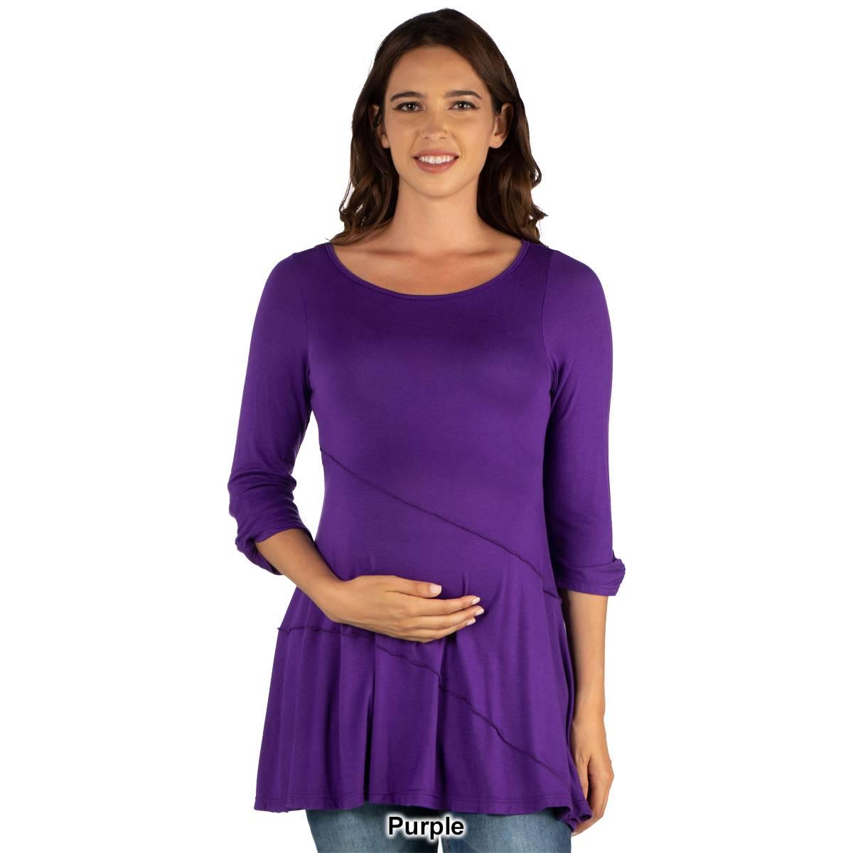 This Plus Size 24/7 Comfort Apparel tunic maternity top is the perfect piece for any season. The tunic offers both comfort and style and is versatile enough for everyday wear. Features ruched 3/4 sleeves, merrow stitch details along the front, loose flare style, and beautiful boat neckline.