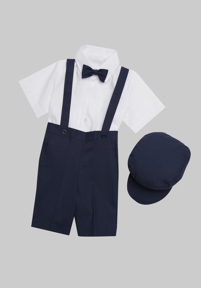 For your next big occasion, dress your little gentleman in this elegant, all-in-one set. This stylish childrens shorts suit is perfect for weddings, especially for ringbearers and any other formal wear occasion. Detailed with pick-stitching and tailored with a Slim Fit, this set includes a matching cap, crisp, white dress shirt, and a pre-tied, adjustable tie. Peanut Butter Collection Slim Fit Eton 5-Piece Shorts Suit Set.