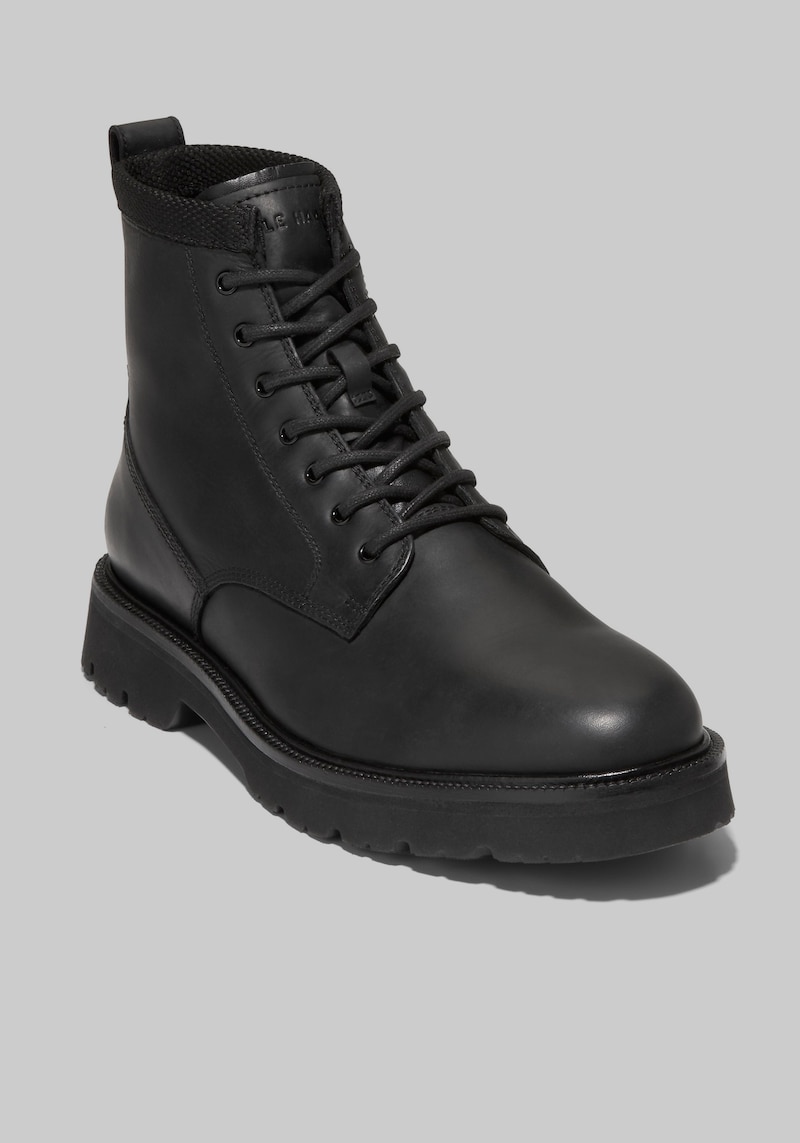 Weather the elements in style with these waterproof lace-up boots from Cole Haan. The segmented rubber sole provides plenty of traction when the sidewalks are slick, and the leather pull tab in back allows for easy ons and offs. Cole Haan American Classics Plain Toe Boots.