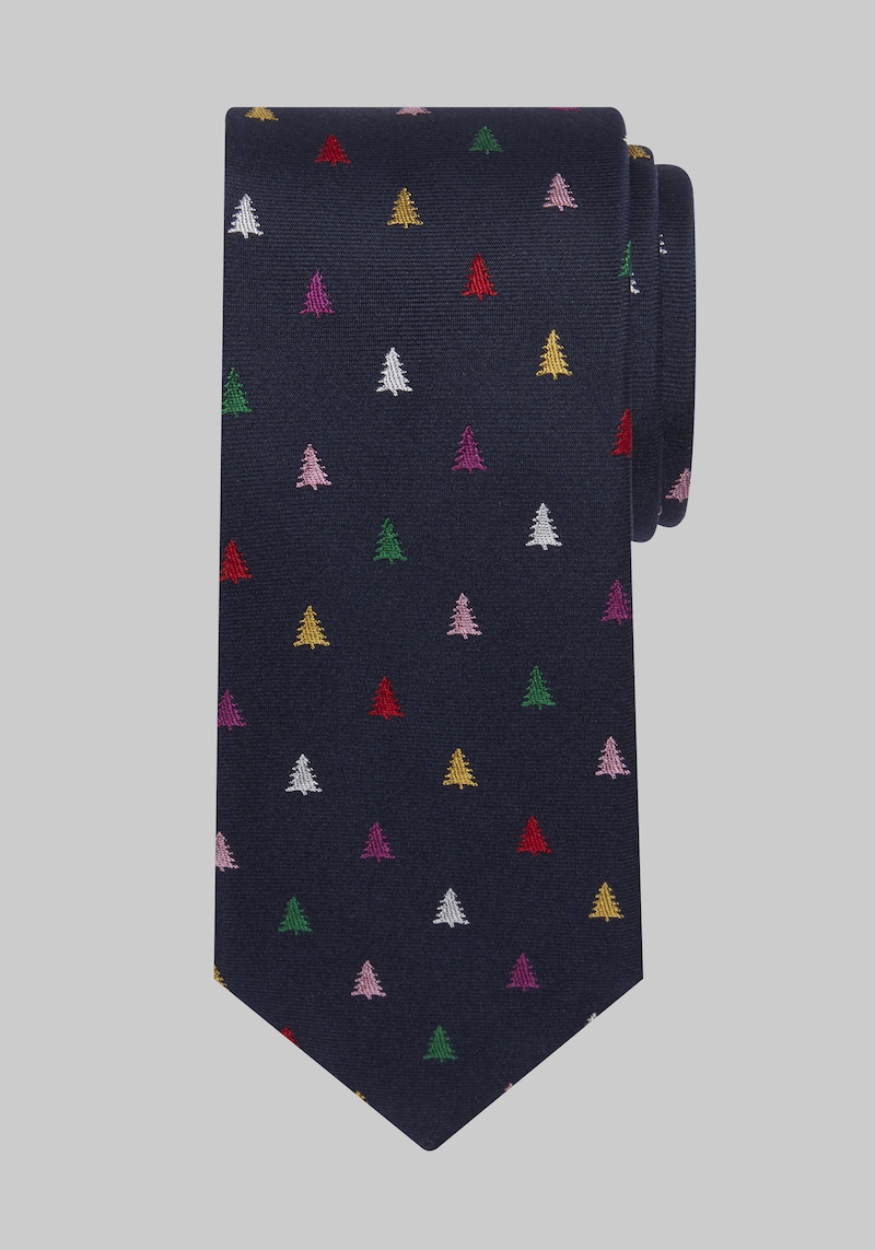 Ditch the expected tartan plaids and snowflakes. This twist on a classic accessory boasts a whimsical pattern of miniature Christmas trees in a surprising color palette. Crafted from luxurious silk, this tie offers a smooth feel and a touch of sophisticated sheen. Pair it with a solid color dress shirt and a well-tailored suit and be the life of the holiday party with the perfect blend of personality and festive flair. Jos. A. Bank Multi Tree Tie.