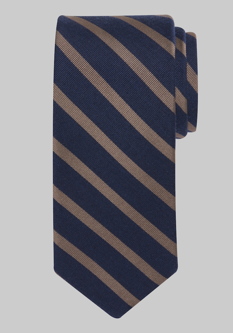 Channel classic preppy style with this repp stripe tie. This collegiate-inspired accessory boasts alternating thin and wide stripes. This tie is crafted from a luxurious blend with a hint of silk, ensuring both durability and a smooth feel that drapes beautifully. Its the perfect finishing touch to a crisp button-down shirt and chinos, or it can add a touch of polish to a casual sport coat. Jos. A. Bank Repp Stripe Tie.