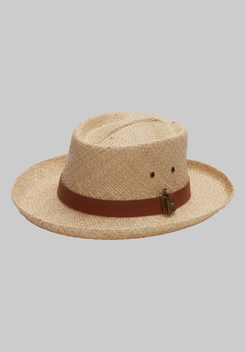 This gambler fedora is a stylish and lightweight accessory perfect for warm weather. Crafted fromraffia, it features a classic gambler silhouette and a durable leather headband with grommet details. The breathable material and comfortable fit make it ideal for outdoor activities and casual outings. Jos. A. Bank Raffia Gambler Fedora.