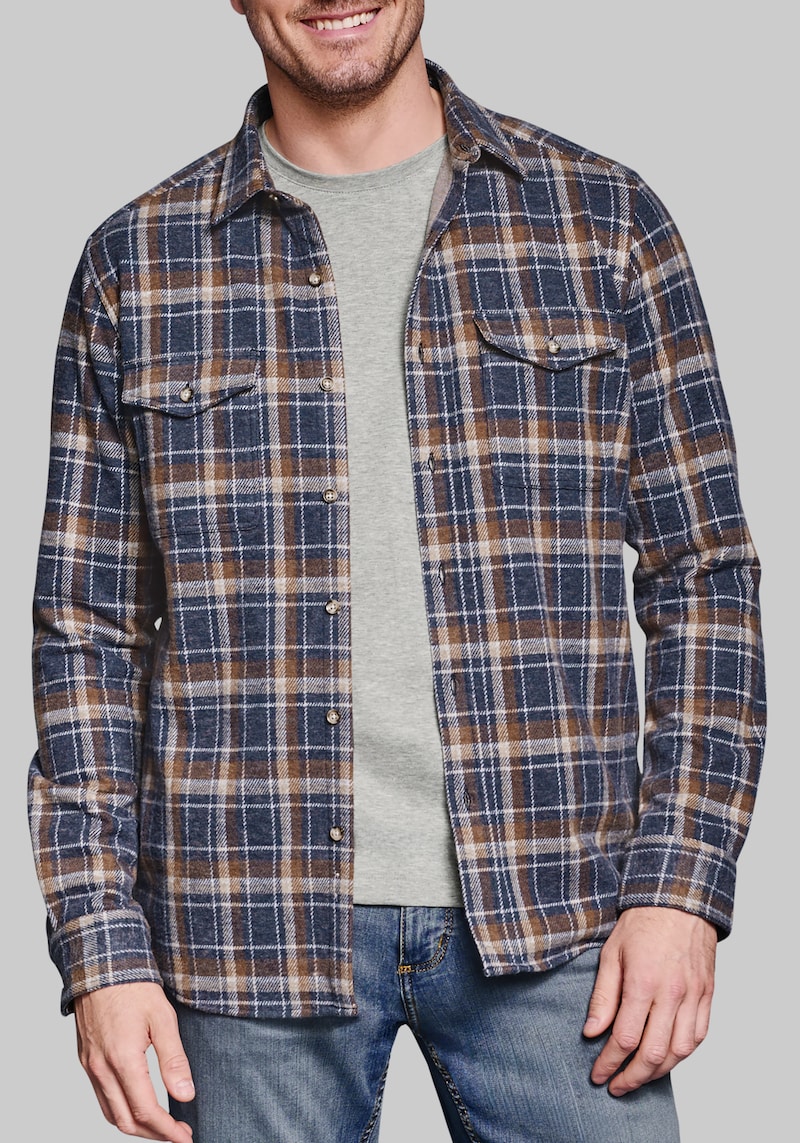 Woven in a luxuriously soft, brushed knit, this ruggedly handsome shirt offers exceptional comfort and warmth. The shirt-jacket weight makes it perfect for layering over a tee, while the point collar and button-flap chest pockets provide a classic look. Johnston & Murphy Tailored Fit Brushed Button-Front Knit Shirt.