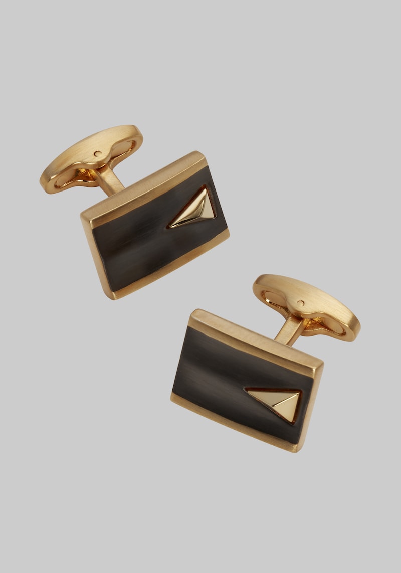Brushed gunmetal over a rose gold-tone creates a modern yet majestic look on these mixed metal cufflinks. Topped off with a triangular accent piece, they will add sleek sophistication to your dress attire. Jos. A. Bank Rose Gold & Gunmetal Cufflinks.