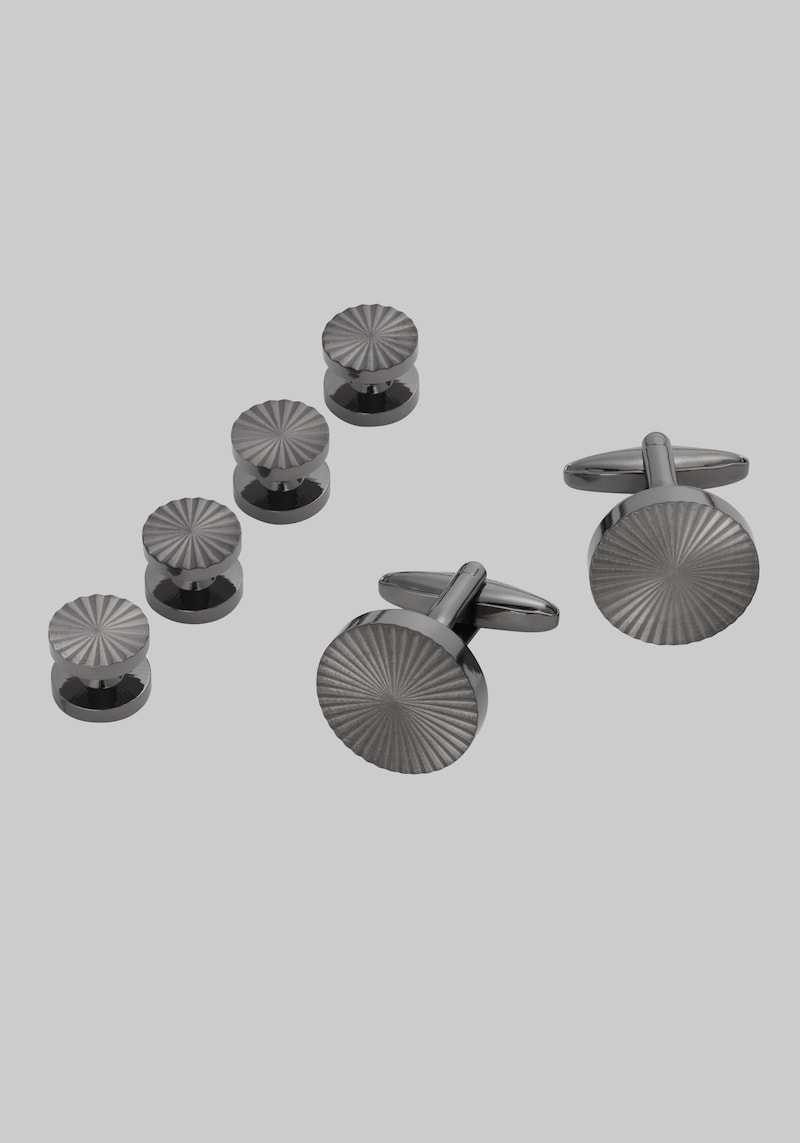 Add a touch of modern elegance to your formal attire with this cufflink and stud set. Featuring a striking spiral design in a gunmetal finish, this set offers a unique and eye-catching look. The intricate spiral pattern adds depth and dimension, making it a perfect accessory for the fashion-forward gentleman. Jos. A. Bank Textured Spiral Cufflink & Stud Set.