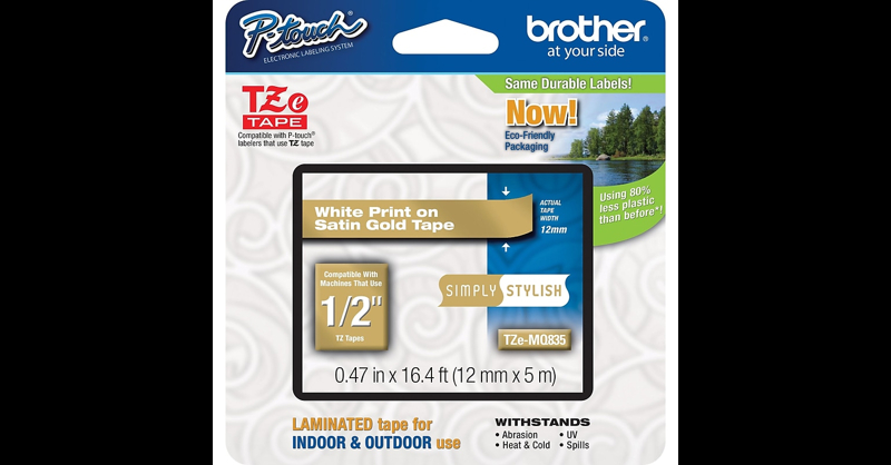 The Brother P-Touch 1/2" label tape in white on satin gold features a laminated adhesive back for textured, rough, and uneven surfaces. This tape is designed for use in indoor and outdoor applications. 47/100" Wide. 16 2/5' Long. White on Satin Gold. For use with: OEM. For use with: GL-100, PT-1000, PT-1000BM, PT-1010, PT-1010B, PT-1010NB, PT-1010R, PT-1010RDT, PT-1010S, PT-1090, PT-1090BK, PT-1100, PT-1100QL, PT1100SB, PT-1100SBVP, PT-1100ST, PT-1120, PT-1130, PT-1160, PT-1170, PT-1170S, PT-1180, PT-1180SC, PT-1180SP, PT-1190, PT-1200, PT-1230PC, PT-1280, PT-1280BT, PT-1280SP, PT-1280SR, PT-1280VP, PT-1290, PT-1290BT, PT-1290BT2, PT-1290RS, PT-1300, PT-1400, PT-1500, PT-1500PC, PT-1600, PT-1650, PT-17. 1/2x16-2/5" white on satin-gold laminated label tape. Replaces TZ-MQ835. PVC-free plastic, eco-friendly packaging, cassette contains 13% less plastic. Cassette contains at least 5% recycled material. Permanent adhesive. Designed for indoor and outdoor use, including hot and cold environments. Glossy finish. For use with P-touch TZ-series labelers. The Brother P-Touch 1/2" label tape in white on satin gold yields up to 16. 4' and is made of recycled material for added durability.