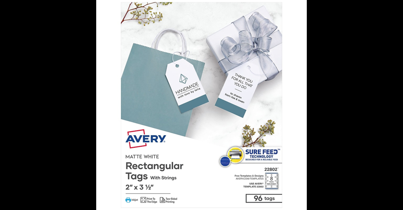 Add a personal touch to products, gifts, or favors with this 96-pack of Avery 22802 customizable tags with strings. Perfect for showcasing your brand or personal message, these 2 x 3. 5 matterectangular tags come with pre-punched holes andfabric strings that can be tied for easy and secure attachment. Handwrite directly on each tag for one-of-a-kind creations, or for a more professional look, personalize your hanging tags with your own text, art, and photos using Avery Design & Print Online and print them on demand. Our design software also includes Avery templates, fonts, and easy-to-use tools for creating beautiful, double-sided custom tags. The 8. 5 x 11 printable sheets are optimized for both laser and inkjet printers for crisp, smudge-free printing. Our Print-to-the-Edge feature allows you to create eye-catching, full-bleed customized tags printed with no border or margin. Each sheet also features a Sure Feed technology grip strip for a more reliable printer feed, helping reduce printer misalignments and minimize paper jams. Ultra-fine perforations let you easily separate each tag with no frayed edges for neat and polished results. Create your own custom product tags, QR tags, tags for labeling, bag tags, Christmas tags, and more. This item comes with 962 x 3. 5 tags with string. Save time and hassle with ready-to-assemble tags that are pre-punched with holes and include strings for quick and easy attachment to products, bags, gifts, and more. Easily personalize tags for any occasion using your own text and graphics, or create custom tags with strings using Avery Design & Print and our available tag templates, fonts, and designs. Get a more reliable feed through your printer with blank gift tag sheets featuring patented Sure Feed technology that helps minimize misalignment and paper jams. Create professional-looking double-sided custom tags with our print-to-the-edge feature, allowing for full-bleed designs that extend to the very edge of the tag. Stand out with a polished, high-quality presentation when using hang tags that are optimized for both laser and inkjet printers for crisp and smudge-free printing. Get products and promotions noticed with this 96-pack of Avery 2" x 3. 5" printable tags with strings.