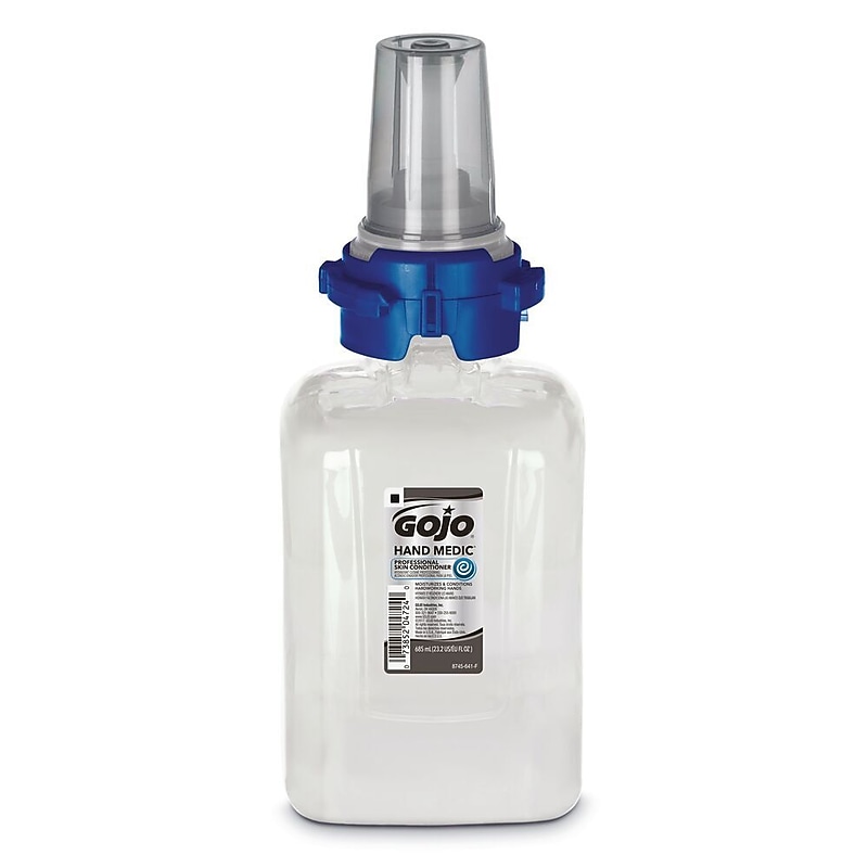GOJO HAND MEDIC Professional Skin Conditioner refill for GOJO HAND MEDIC ADX-7 dispenser - heavy duty hand conditioner. Pack of 4. Fragrance free skin conditioner, specially formulated for industrial environments. Silicone and fragrance free formula absorbs quickly and nourishes skin, with non greasy residue. Specially formulated for professional technicians and workers in tough soil environments, proven under actual workplace conditions; helps maintain skins moisture level. Controlled collapse technology maintains bottle shape longer while emptying. SANITARY SEALED refill helps prevent contamination and comes with a fresh dispensing valve on every refill. Safety Data Sheet . Fragrance-free skin conditioner, specially formulated for industrial environments.