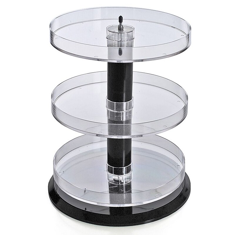 Azar Displays Three Tier Acrylic Open Round Tray features three 11" round trays along with a revolving base, providing easy customer access. Its base and center tube is available color. Ideal for displaying small products!. Material: Acrylic. Shipping Weight: 7 lbs. Type: Open Round Tray. Azar Displays Three Tier Acrylic Open Round Tray with black base and center tube.