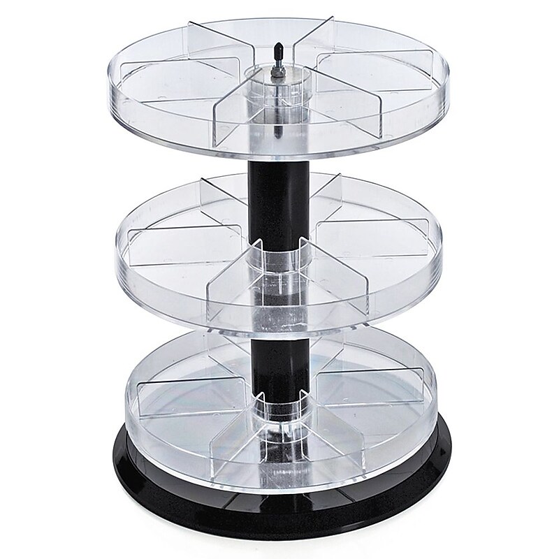Three Tier Acrylic Counter Display with Dividers by Azar Displays features three 11" round trays with 6 compartments for each tray. It is designed to create ease for the customers to have an access to all products on the display. Material: Acrylic. Color: Black Type: Counter Display. Size: 11" x 13. 5". Shipping Weight: 7 lbs. Compartment: 18. Three Tier Acrylic Counter Display with Dividers by Azar Displays - For commercial use to display cosmetic products.