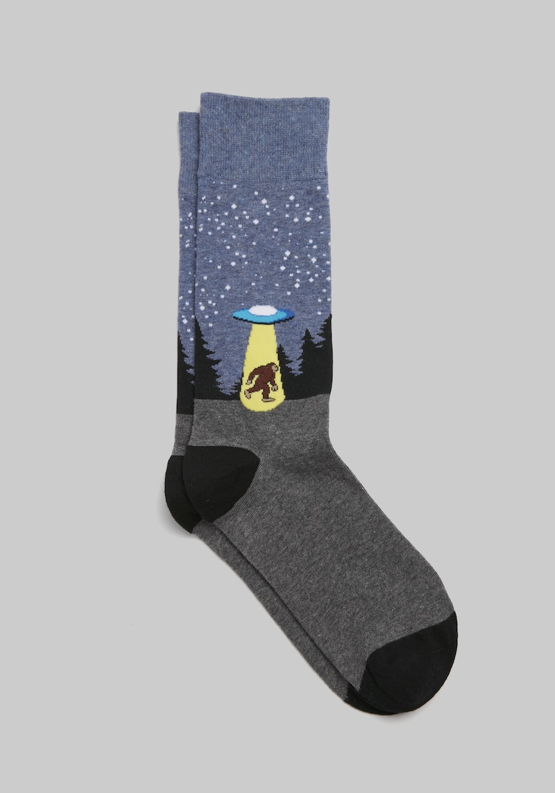 A UFO spotlights Big Foot running through the woods on a starry night on these extraordinary Jos. A. Bank dress socks. Jos. A. Bank Big Foot & UFO Socks.