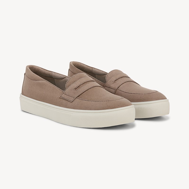 Womens loafers atop a sport sole for laidback extra-comfy mocs. SUSTAINABLY CRAFTED: Fabric linings and topcloth partially made from recycled plastic bottles; partially recycled toe box and heel counter. MATERIALS: Faux leather upper or fabric partially made from recycled plastic bottles. FIT: Slip on fit for easy on/off. SUSTAINABLE COMFORT: Anti-microbial anti-odor Insole Technology with cushioning comfort & arch support that uses 15% cushy plant-based BLOOM foam insole. MOVEMENT: Lightweight flexible construction moves with you. FEEL-GOOD FLEX: Ultra-flexible outsoles with extra grip and cushioning. STYLE: Sporty womens loafers with faux penny keeper strap round toe and 1 inch sport sole. CONSCIOUSLY PACKAGED: This style is shipped in an environmentally preferred 1-piece box made with primarily recycled materials that can be recycled & soy-based inks. Closet essentials. Your fave slip on sneakers remixed as loafers create cute comfort shoes. Dr. Scholl's Women's Nova Moc Slip On Shoes (Mocha Taupe Fabric).