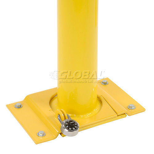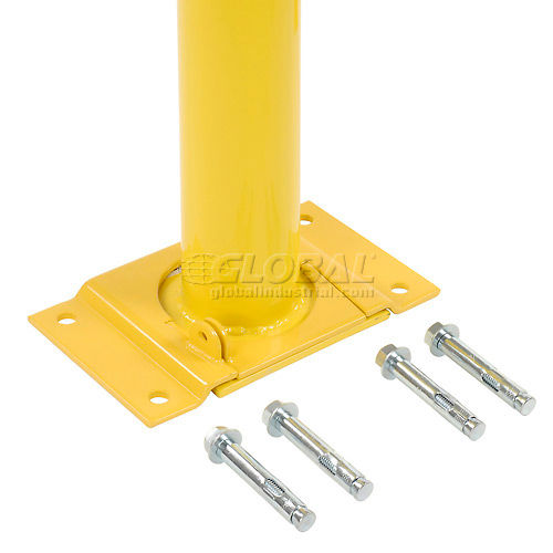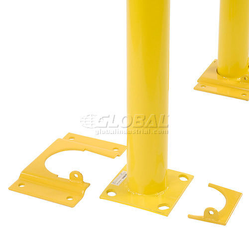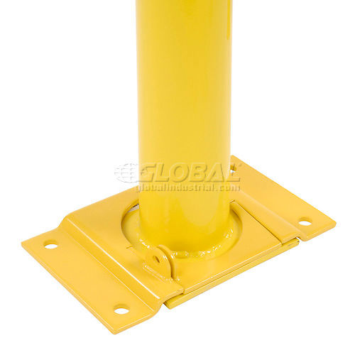 Removable Steel Machinery Rack Guard 48"H x 48"L - 443481 REMOVABLE STEEL SAFETY GUARDS AND BOLLARDS 48 L x 48 H x 4-1/2 Diameter Machinery Guard with Padlockable Base Steel safety guards feature a detachable base plate design that allows quick and easy guard removal. Removable plates feature a pull-out side that allows the rack or bollard to slide out of mounted position temporarily to provide full access to machines, racks, loading docks, security areas and more. Detachable base features a padlockable hasp for security when in place (lock sold separately). Base plates allow floor anchoring for stability. Safety guards are made with heavy duty, welded steel. Safety yellow powder coat finish with black visibility stripes.
