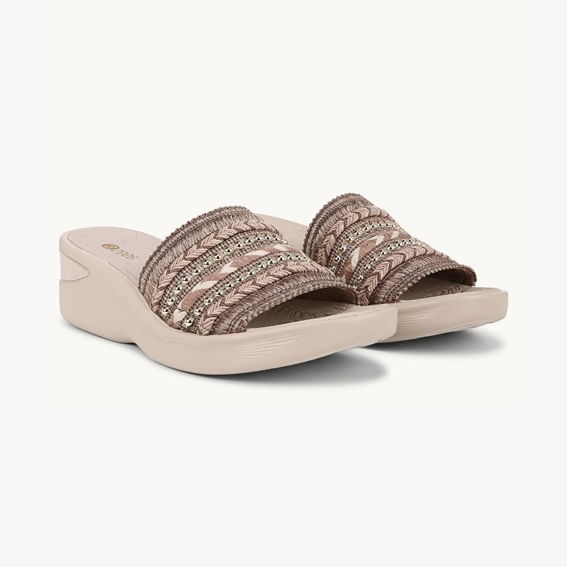 Fun in the sun! Sit poolside all summer long in these slide sandals with beaded + braided details. Stretch fabric upper with partially recycled linings embellished details and a round toe BZEES Air Step Technology: Designed so you'll feel weightless energized and free Ultra Lightweight: Step lightly with a nearly weightless feel Dynamic Stretch Fabrics: Move freely in shoes with built-in stretch Free Foam Comfort: Low pressure insoles with maximum foot contact and cushy arch support So Cush arch support Anti-Microbial and Odor Control technology3/4 inch platform 1 3/4 inch heel Get Width It: Countless pairs of Bzees come in wide width shoes for women Machine Washable: Wash on cold and air dry Bzees For Life Stride Shoes Sunshine Wedge Sandal (Beige Embellished Fabric) 11.0.