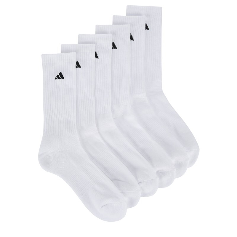 All over comfort in the 6 Pack Athletic Crew Socks from Adidas. Polyester and elastane. Climalite fabric wicks away moisture for a cool dry feel. 360-degree cushioning for comfort and durability. Crew length. 6 pack socks. Fits men's shoe sizes 6-12.