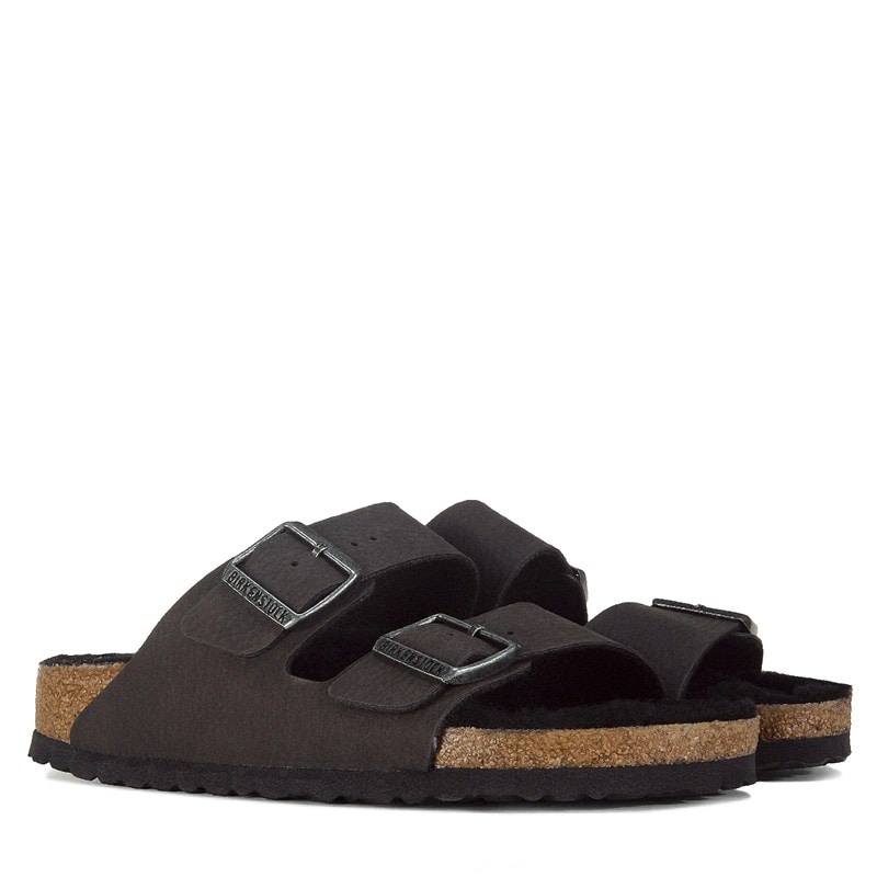 Slip into comfort with the Women's Birkenstock Arizona Shearling Footbed Sandal. Synthetic leather upper in a footbed sandal style with an open toe. Backless slip on entry. Two straps each with an adjustable metal pin buckle. Shearling lining and footbed. Anatomically shaped cork-latex footbed. Durable EVA outsole.
