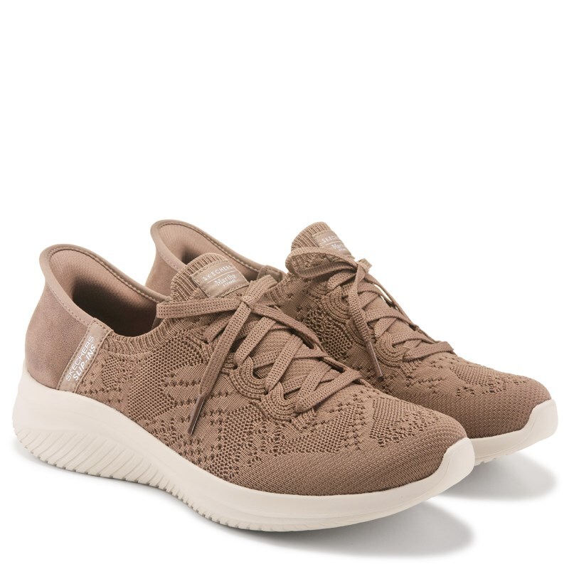 Celebrated lifestyle expert Martha Stewart delivers her one-of-a-kind touch to Women's Skechers Martha Stewart Ultra Flex 3.0 Back On Track Knitted fabric upper in a slip on shoe style with a round toe. Hands Free Slip-ins for an easy fit. Decorative lace front. Stretch Fit design for sock-like comfort. From the Martha Stewart x Skechers collaboration. Skechers and Martha Stewart logo details. Skechers Air-Cooled Memory Foam cushioned comfort insole. Exclusive Heel Pillow holds your foot securely in place. Machine washable. Crafted with 100% vegan materials. Flexible traction outsole. 158911.