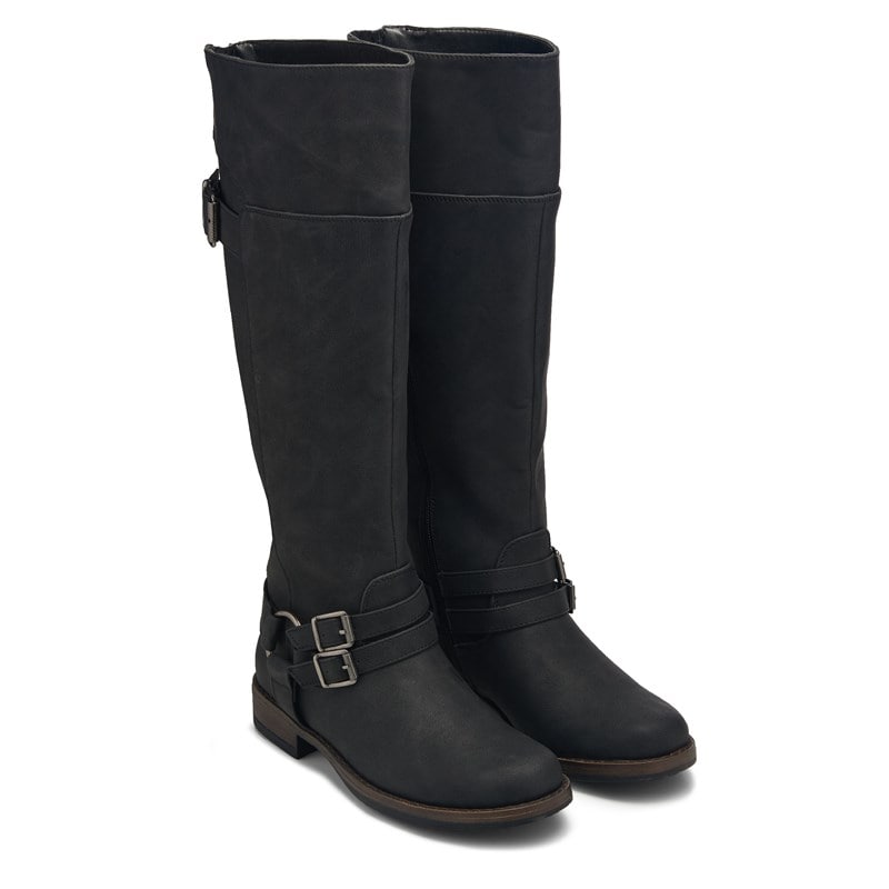 Step out in style in the Women's XOXO Colt Wide Calf Knee High Boot. Faux leather upper in a knee high boot with a round toe. Zipper closure. Adjustable buckle strap for a secure fit. Smooth lining with a padded insole. Durable synthetic outsole.