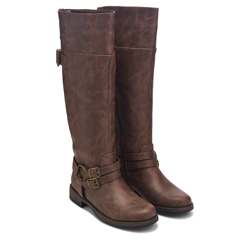 Step out in style in the Women's XOXO Colt Wide Calf Knee High Boot. Faux leather upper in a knee high boot with a round toe. Zipper closure. Adjustable buckle strap for a secure fit. Smooth lining with a padded insole. Durable synthetic outsole.