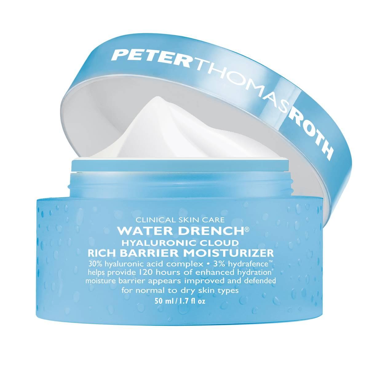 Peter Thomas Roth's Water Drench Hyaluronic Cloud Rich Barrier Moisturizer is a rich barrier moisturizer with a 30% Hyaluronic Acid Complex that provides enhanced barrier defense and drenches your skin with protective moisture. How to use: Apply rich barrier moisturizer twice daily to face and neck with continued use. Benefits: Rich barrier moisturizer provides enhanced barrier defense Drenches skin with a 30% Hyaluronic Acid Complex 3% HydraFence, a breakthrough ingredient technology, helps provide 120 hours of enhanced hydration* Moisture Barrier Boosting Complex helps combat the drying effects of external dehydrators Helps visibly reduce the look of dryness, fine lines, and wrinkles For normal to dry skin types, fragrance-free Ingredients: Water/Aqua/Eau, Dimethicone, Glycerin, Dimethiconol, Dipropylene Glycol, Yeast Extract, Squalane, Sodium Hyaluronate, Vaccinium Vitis-Idaea Fruit Extract, Gluconolactone, Calcium Gluconate, Polyglutamic Acid, Amylopectin, Lactic Acid, Lithothamnion Calcareum Extract, Hydrolyzed Silk, Tocopherol, Sodium PCA, Citric Acid, Sodium Citrate, Sodium Chloride, Propanediol, Pentylene Glycol, Sodium Benzoate, Potassium Sorbate, Xanthan Gum, Ethylhexylglycerin, Lauryl PEG-9 Polydimethylsiloxyethyl Dimethicone, Dimethicone/PEG-10/15 Crosspolymer, Disodium EDTA, Mica, Phenoxyethanol For external use only.