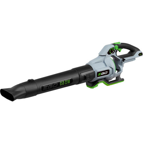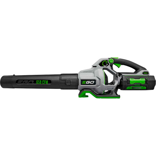 EGO LB6504 POWER+ 56V 650CFM Handheld Cordless Blower Kit with 5.0Ah Battery & Charger The industry's most powerful blower is here! Introducing the 650 CFM EGO POWER+ Blower. With air speeds that compare to a category 5 hurricane of 180 MPH, this blower can move wet leaves, rocks, mud, snow and more. With an all new lock on speed control dial, you can adjust your speed from 250 CFM to 500 CFM. When you are ready to move the heavy debris hit the turbo button for 650 CFM! All of this industry leading power is combined with industry leading run times; over 90 minutes of continuous run time. The high-efficiency brushless motor delivers longer run time, low vibrations and an extended motor life. Turbine fan engineering, inspired by advanced aeronautics technology, performs better than premium gas-powered models. The included flat and tapered nozzles make clearing debris in all conditions easy. This quiet, light-weight and compact blower gets the job done faster and quieter than gas! Experience Power Beyond Belief without the noise, fuss and fumes. Specifications: Turbo Button delivers a staggering 650 CFMVariable-speed control dial delivers 225-500 CFMCruise Control Speed DialOver 90 minutes of run time: 15 minutes on Turbo; 200 minutes on low with 5.0Ah BatteryFlat and tapered nozzle attachments includedBrushless MotoWeather-resistant constructionErgonomic design for superb balance and user comfort5-year limited warrantyIncludes 5.0Ah Battery, 210W Charger, Flat Nozzle, Cone Nozzle.