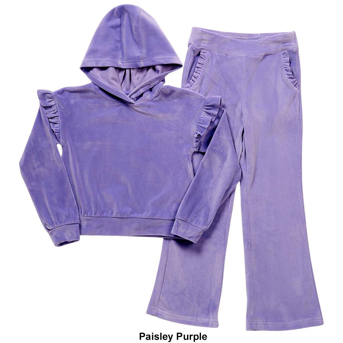Hoodie: Pattern: Solid Sleeve Length: Long Sleeve Front overlapped neckline Ruffle overlay on shoulders Reinforced cuffs and hem Super soft outer velour fabric Pants: Pattern: Solid Detached elastic waist Two side pockets with ruffle trim Flare Styling Super soft outer velour fabric.