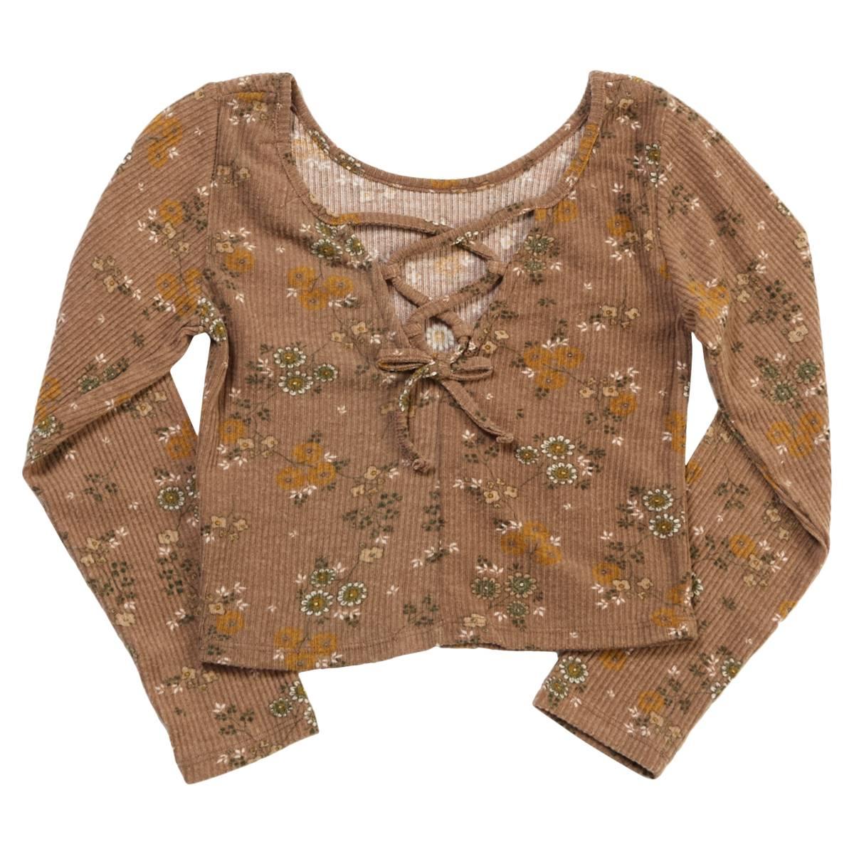 Girls (7-16) Poof Girl Long Sleeve Rib Floral Lace Up Back Top