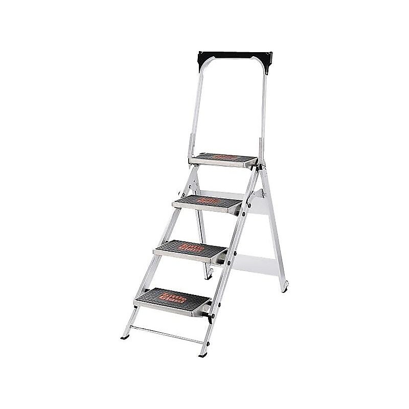 Reach previously inaccessible items with this portable four-stepladder. Slip-resistant treads help you maintain a solid footing, and the fold-up safety bar has an integrated tool tray to keep supplies within reach. Rely on the corrosion-resistant aluminum alloy frame to support up to 300 pounds, and use the flip-down wheels to change the ladder position as needed. This Little Giant stepladder folds down to a slim 5-inch configuration to save space during transport and storage. Compact step ladder made of super-strong, lightweight aluminum for professional and industrial use. Ladder top step height is 35", product weight is 27. 5 lbs. Wide, slip-resistant steps ensure unmatched comfort and stability, support up to 300 lbs. Features a fold-up safety bar with integrated tool tray for paint brushes, tools, etc. Meets or exceeds ANSI 1A type standard. Tray also features two sturdy hooks for hanging paint cans or buckets. Complete with wheels for easy transport. Superslim 5" folded depth makes any transportation and storage easier, storage height is 56". Can handle just about any task, from the lightest house chore to the heaviest industrial job. 1-year manufacturer limited warranty. Get a height boost with this 56-inch Little Giant Safety Step folding stepladder.