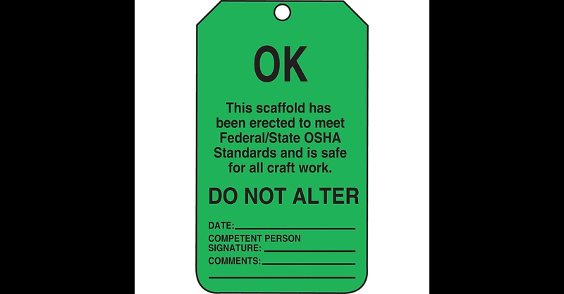 Accuform Signs "OK THIS. " RP-Plastic scaffold status tag measuring 5 3/4" x 3 1/4" is flexible and durable to withstand stretching and ripping. Tag has abrasion resistant writable surface and is ideal for indoor or outdoor use. Size: 5 3/4"(L) x 3 1/4"(W). Material: RP-plastic. Legend: "OK THIS SCAFFOLD HAS BEEN ERECTED TO MEET FEDERAL/STATE OSHA STANDARDS AND IS SAFE FOR ALL CRAFT WORK". Package: 25/pack. Sign language: English. Flexible, yet durable - withstands stretching and ripping. Good for indoors and outdoors use, writable surface is abrasion resistant. High-strength rigid plastic tags suitable for use in tough industrial environments. Front of tag reads, "OK this scaffold has been erected to meet federal/state OSHA standards and is safe for all craft work" followed by blank lined areas labeled "date," "competent person signature," and "comments". 15-mil thick rigid plastic, relatively bendable. Mar-resistant, matte surface is easy to write on with pen or marker. Top has 3/8" hole reinforced with metal grommet. Front of tag also reads, "do not alter". Certifications and standards: OSHA 29 CFR 1910. 145 and ANSI Z535 requirements. Warranty: 30 days limited. Safety Tag. ⚠ WARNING: Cancer and Reproductive Harm www. P65Warnings. ca. gov. Accuform Signs "OK THIS. " 5 3/4" x 3 1/4" RP-Plastic scaffold status tag in black oncolor alert people about dangers that occur in working on or around them, sold as 25 per pack.