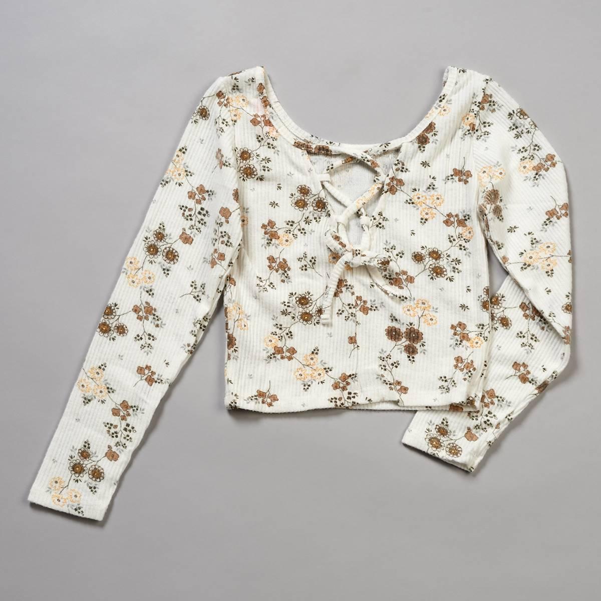 Pattern: Floral Sleeve Length: Long Sleeve Scoop Neck Lace-up back with non-functional drawstring bow Ribbed fabrication for a comfy fit and stretch Super soft outer fabric.