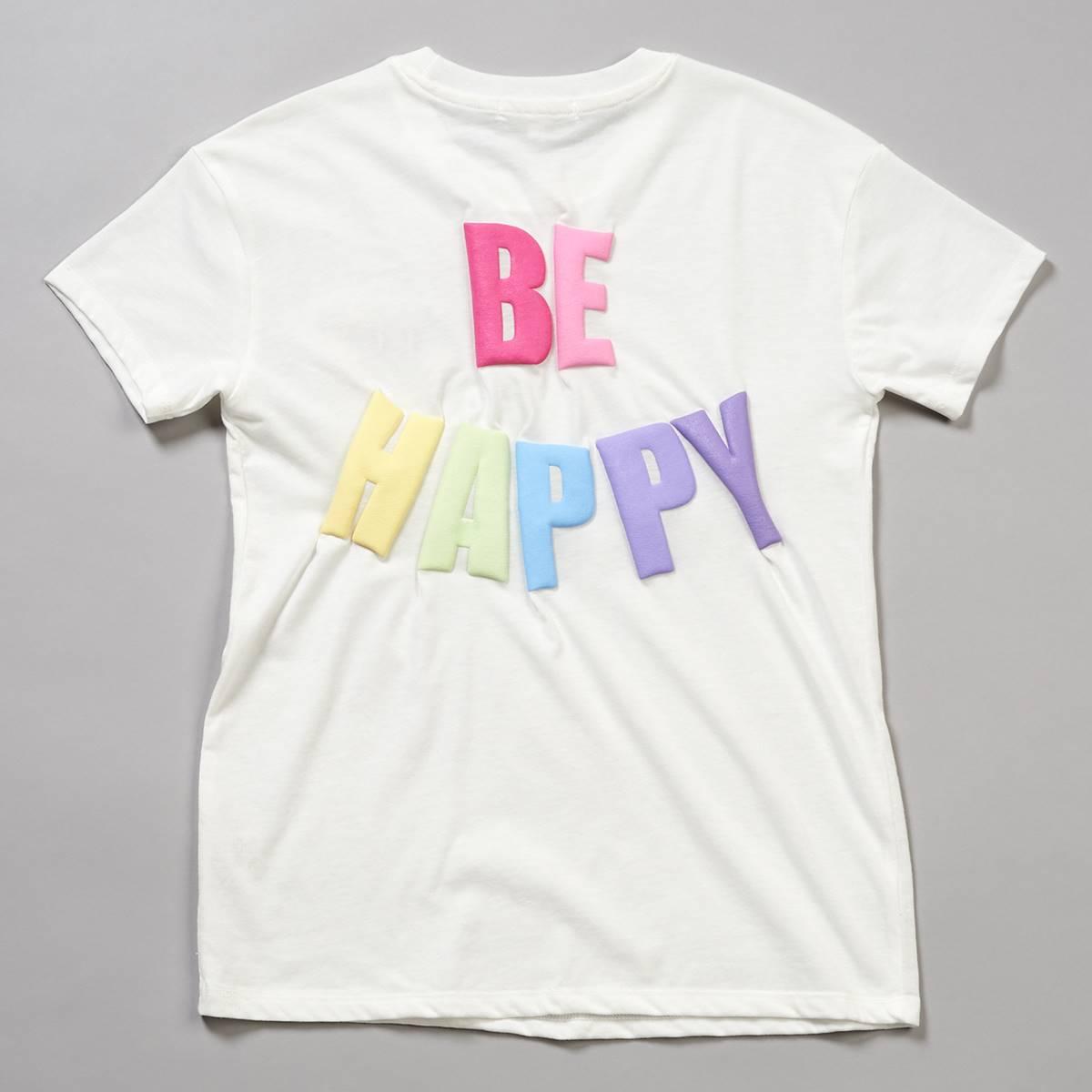 Pattern: Solid Sleeve Length: Short Sleeve Round rib-knit neckline Embroidered smiley face with rainbow colors on left chest Rear embossed "BE HAPPY" text with puffy texture Linear Hemline Oversized for a loose fit Soft Fabric.