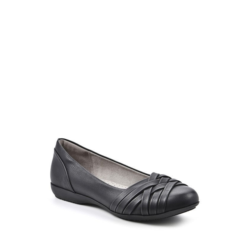 Women's Chic Flat from Cliffs by White Mountain. Faux-leather upper in a casual flat style with a round toe. Slip on entry. Pleated design. Soft lining with a cushioned comfort footbed. Durable traction outsole.