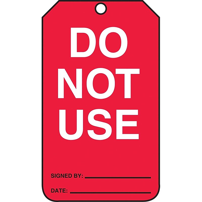 Accuform Signs "DO NOT. " RP-Plastic status tag in whiteon red color measuring 5. 75" 3. 25" has a thickness of 10 mil. Tag can resist water, chemical and includes signed by and date labels at the bottom, sold as 25 per pack. Size: 5. 75"(L) 3. 25"(W). Legend: "DO NOT USE". Package: 25/pack. Sign language: English. Flexible, yet durable - withstands stretching and ripping. Good for indoors and outdoors use, writable surface is abrasion resistant. High-strength rigid plastic tags suitable for use in tough industrial environments. Both sides of tag read, "DO NOT USE" in large white letters with two blank lined areas at the bottom labeled "signed by" and "date". 15-mil thick rigid plastic, relatively bendable. Mar-resistant, matte surface is easy to write on with pen or marker. Top has 0. 375" hole reinforced with metal grommet. Certifications and standards: OSHA 29 CFR 1910. 145 and ANSI Z535 requirements. Warranty: 30 days limited. Safety Tag. 15-mil RP-Plastic. ⚠ WARNING: Cancer and Reproductive Harm www. P65Warnings. ca. gov. Accuform Signs "DO NOT. " 5. 75" 3. 25" RP-Plastic status tag in whiteon red color has 0. 375" hole for easy installation and prohibits the use of a machine or device with both side reading, sold as 25 per pack.