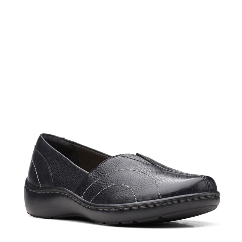 Find classic Clarks comfort in the Women's Cora Meadow Slip On Shoe. Leather upper in a slip on shoe style with a round toe. Slip-on entry. Textile lining with OrthoLite comfort footbed. Wedge midsole with stitching. Thermoplastic rubber outsole.