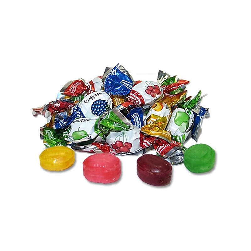 Mini Fruit Filled Hard Candy Assortment, 2. 2 lb. Bag,Colombina. Assorted fruit flavors: Peach, Green Apple, Cherry, and Blackberry. 2. 2 lb. bag. Individually wrapped miniature candies. An assortment of vibrantly wrapped fruit-filled hard candies.