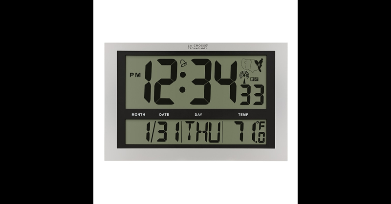 Wake up on time and stay on schedule with this jumbo atomic digital wall clock. Featuring a 4-inch time display with large, easy-to-read numbers, this atomic clock lets you choose between four time zones and automatically tells the exact time in 12- and 24-hour formats. This La Crosse Technology clock keeps you informed of the date and monitors and displays indoor temperatures. Atomic digital clock withplastic frame. Automatically Updates for Daylight Saving Time (On or Off Option). Runs on three AA batteries (not included). Large 4" time display with Arabic numbers. Four time zones: Eastern, Central, Mountain, and Pacific. Low battery indicator helps to change batteries on time. Monitors indoor temperature (in degrees F or degrees C). 1-year manufacturer limited warranty. 12/24-hour time selection is available. ⚠ WARNING: This product can expose you to chemicals including acrylonitrile, 1,3-butadiene, and styrene, which are known to the State of California to cause cancer and birth defects or other reproductive harm. For more information go to: www. P65Warnings. ca. gov. . Keep time with scientific precision and monitor indoor climates with this La Crosse Technology jumbo atomic digital wall clock.