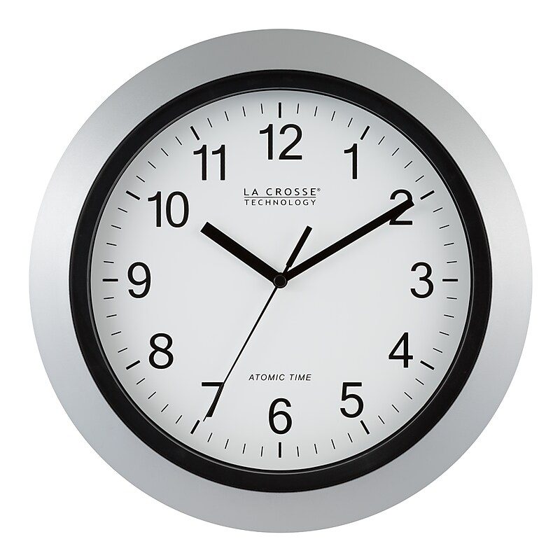 Keep track of time with impressive precision by using this atomic wall clock. Featuring large, bold numerals, this atomic clock offers easy visibility from across the room and keeps you on schedule by automatically setting itself to the exact time. This La Crosse Technology clock lets you choose between four time zone settings and automatically corrects for daylight saving time. Utilizes quartz movement mechanism. Runs on one AA battery (not included). White dial with black Arabic numbers. Daylight Saving Time automatically updates (On/Off option). Four time zones: Eastern, Central, Mountain, Pacific. Automatically sets to exact time. This clock makes use of atomic time with manual setting. 1-year manufacturer limited warranty. ⚠ WARNING: This product can expose you to chemicals including styrene, which is known to the State of California to cause cancer. For more information go to: www. P65Warnings. ca. gov. Upgrade your workplace with the style and precision of this La Crosse Technology 12-inch atomic wall clock.