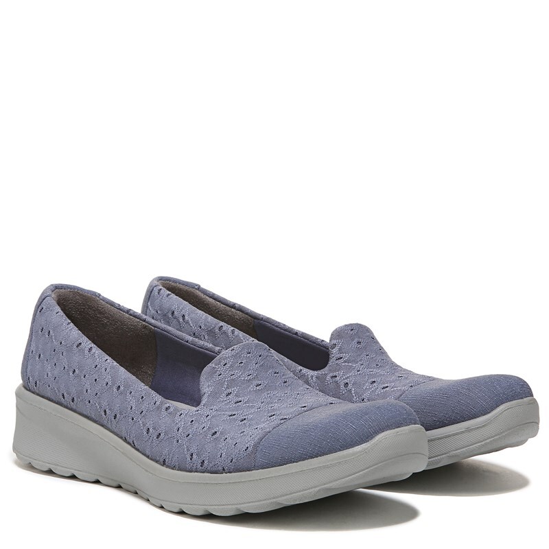 Easy on. Easy off. Our versatile slip-ins with an eyelit design and slight wedge heel are perfection. Stretch fabric upper with partially recycled lining and round toe. Slip-ins for easy on/off. BLOOM materials: Eco-conscious algae-infused foam layer under the insole. BZEES Air Step Technology: Designed so you'll feel weightless energized and free. Ultra Lightweight: Step lightly with a nearly weightless feel. Dynamic Stretch Fabrics: Move freely in shoes with built-in stretch. FreeFoam Comfort: Low pressure insoles with maximum foot contact and cushy arch support. SoCush arch support. Anti-Microbial and Odor Control technology. 5/8 inch platform 1 3/8 inch heel. EVA outsole. Get Width It: Countless pairs of Bzees come in wide width shoes for women. Machine Washable: Wash on cold and air dry.