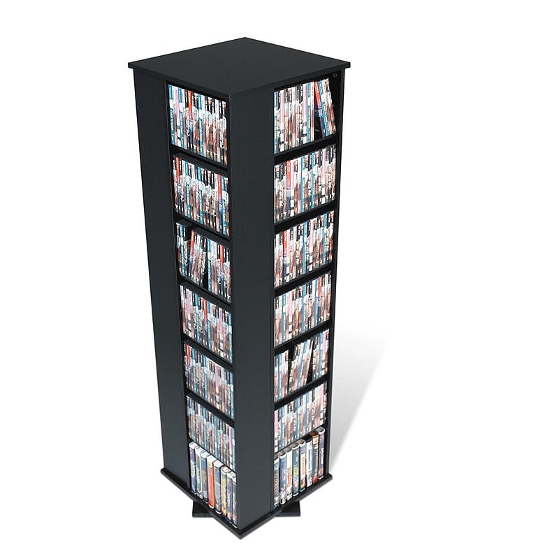 Prepaclarge four sided spinning tower rack features horizontal storage for easy sorting, filing and re-filing of your collection. Rack has an adjustable shelf that holds 1040 CDs, 476 DVDs, 832 blu-ray discs and 280 VHS cassettes. Spinning tower. Dimensions: 65"(H) x 18. 75"(W) x 18. 75"(D). Number of shelves: 36. Frame material: Wood. Capacity: 1040 CDs, 476 DVDs, 832 Blue-ray discs, 280 VHS cassettes or any combination thereof. Storage capacity: 13 cu. ft. Finished in durable laminate. Assembly required. Constructed from CARB-compliant, laminated composite wood with a sturdy MDF backer. Adjustable shelves hold a variety of media sizes. Includes an instruction booklet for easy assembly. Warranty: 5 years limited. ⚠ WARNING: This product can expose you to chemicals including Wood Dust, which is known to the State of California to cause cancer. For more information, go to www. P65Warnings. ca. gov/furniture. Additional information regarding this label can be found at www. prepacmfg. com/Prop65. Prepaclarge four sided spinning tower rack is made out of high quality laminated composite wood material and holds more than 1000 CDs.