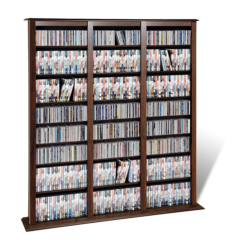 Prepac Triple width barrister tower finish features fully adjustable shelves that can accommodate any size and type of media collection. Tower is trimmed with stylish accent moldings for a sleek and traditional look. Espresso. Barrister tower. Dimensions: 63. 75"(H) x 57"(W) x 9. 5"(D). Number of shelves: 27. Frame material: Wood. Capacity: 1173 CDs, 567 DVDs, 960 Blue-ray discs, 336 VHS cassettes or any combination thereof. Storage capacity: 19 cu. ft. Finished in durable laminate. Assembly required. Constructed from CARB-compliant, laminated composite wood with a sturdy MDF backer. Adjustable shelves hold a variety of media sizes. Includes an instruction booklet for easy assembly. Warranty: 5 years limited. ⚠ WARNING: This product can expose you to chemicals including Wood Dust, which is known to the State of California to cause cancer. For more information, go to www. P65Warnings. ca. gov/furniture. Additional information regarding this label can be found at www. prepacmfg. com/Prop65. Prepac Triple width barrister tower finish gives you a practical and stylish storage for any multimedia collection ensuring easy sorting, filing and refilling of your multimedia collection.