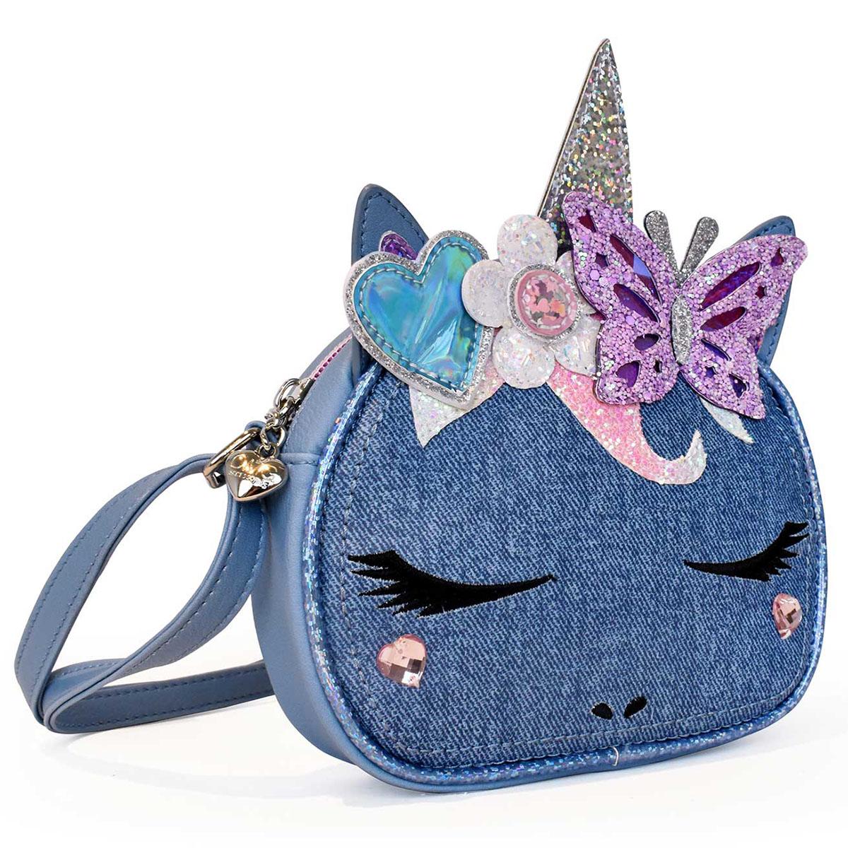 Pattern: Solid, Denim Round Frame Denim front design with embroidered unicorn eyes and nostrils Faux gem heart cheek accents 3D ears and horn with holofoil detail 3D heart, daisy, butterfly, and unicorn hair accents with colorful chunky glitter Heart is mainly blue holofoil Daisy has a confetti shaker Butterfly has cutouts with pink foil underneath Blue holofoil trim around front Rest of bag is solid faux leather styling One main compartment with ombre zipper closure Heart shaped pull tab with engraved logo Adjustable long body strap with metal hardware Dimensions: 5"H x 6"W x 1.5"D Ages 3+ WARNING: CHOKING HAZARD - Small Parts. Not for children under 3 years. Caution: DO NOT WASH.